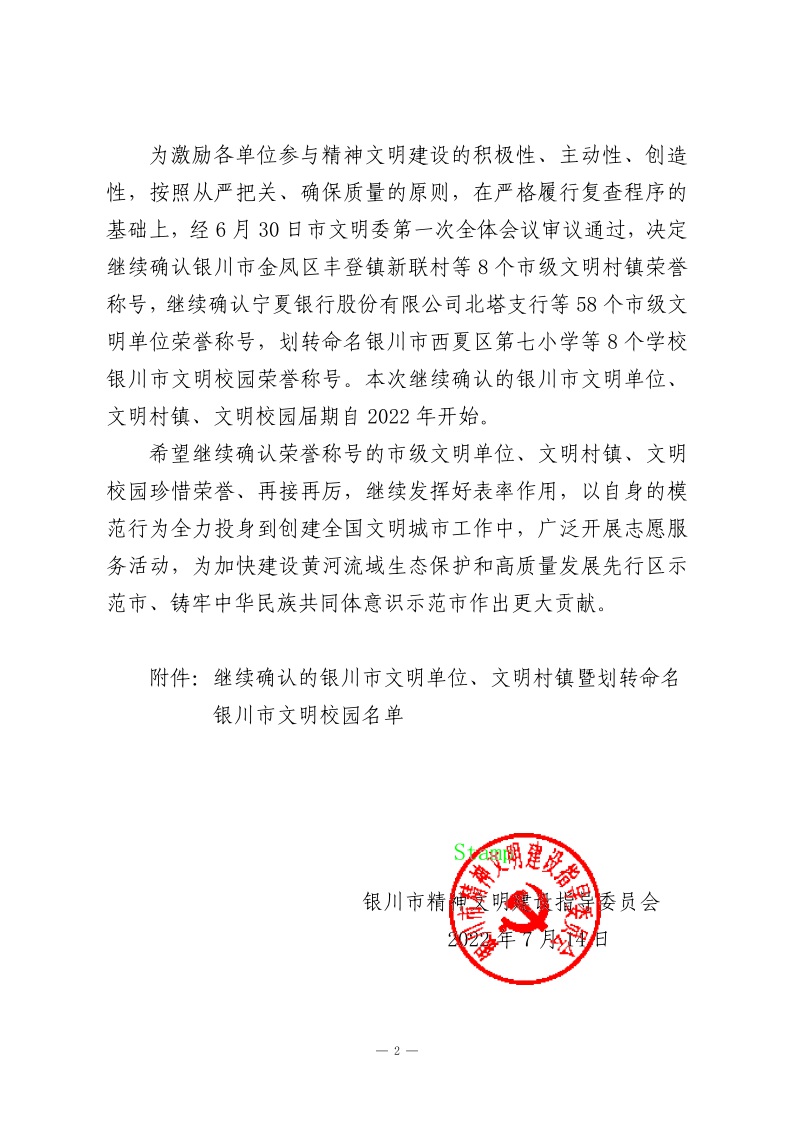日前,银川市文明委第一次全体会议审议通过,公布了划转命名的8所获银川市文明校园荣誉称号的学校,宁夏工商职业技术学院荣获市级文明校园荣誉称号,本次继续确认的银川市文明校园届期自2022年开始。
