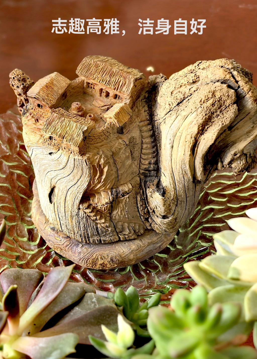“陋室雅韵”雕刻作品以掩映在山顶的老屋小院为题材,意象呈现瓦房、石阶、水井、磨盘、小院等元素,寓意对老家和初心的坚守。作品选用海拔一千多米悬崖峭壁的崖柏为材料,其独特纹理和醇厚香味象征着历经沧桑而初心不改的品质。创作团队从取材、设计、文案创作到拍摄,经过多次论证和修改,最终完成作品并取得版权登记。