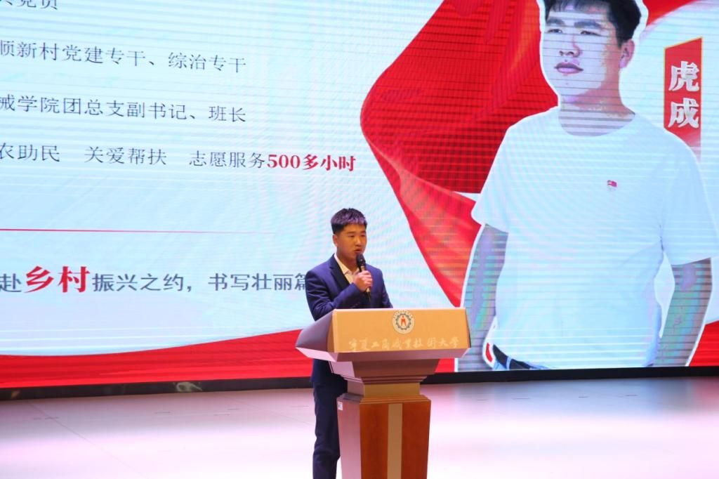 “学模范”环节邀请青年榜样现场分享,用真实经历诠释“感恩”如何转化为“报国”行动。2025届优秀毕业生虎成分享了毕业后回到家乡,利用技能助力家乡产业发展的事迹。从校园学子到家乡建设的参与者,他用所学回报家乡,让“感恩” 有了最生动的模样。