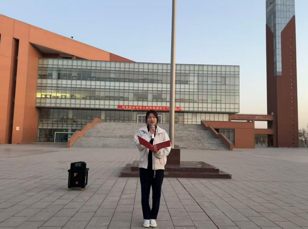 2025级旅游管理1班学生杨晶做《以青春之我,筑团结之基,赴时代之约》国旗下的演讲。她呼吁全体学生要倍加珍惜和谐幸福的新时代,共同奋斗,在学习、生活上像石榴籽一样紧紧团结在一起,坚定不移跟党走,做民族团结的坚定拥护者、有力宣传者和忠实践行者。
