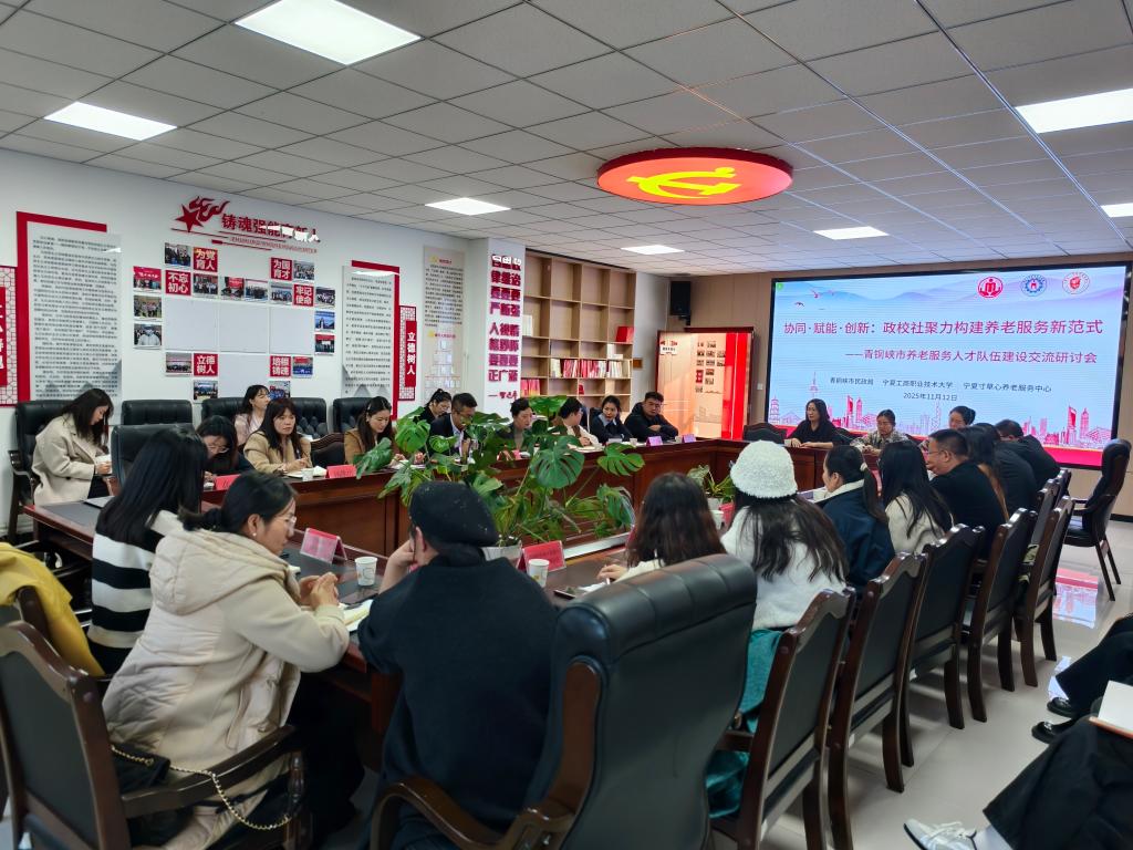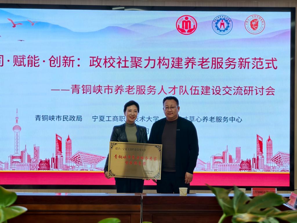在交流座谈会上,人文教育学院院长董丽华介绍了学院智慧健康养老服务与管理专业建设、校企合作及人才培养成果,学校职业技能鉴定所副所长方正剑对养老服务行业相关职业技能鉴定的政策要求作了详细解读。与会双方围绕“深化产教融合 共育养老人才”的主题进行了热烈的研讨交流。最后,青铜峡市民政局养老科主任张彦青代表青铜峡市民政局宣读了《关于聘请宁夏工商职业技术大学人文教育学院公共管理教研室为青铜峡市养老服务专家智库指导团的决定》,并现场授牌,为“政、校、社”三方深入合作拉开了序幕。