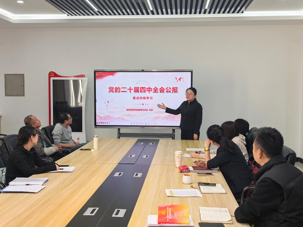 学院教师党支部书记苏黎以“解读全会公报 锚定教育航向”为主题讲专题党课,全体教师党员参会学习。党课梳理了党的二十届四中全会核心要义与实践要求,重点解读了“十五五”时期经济社会发展目标、高质量发展要求及教育、科技、人才协同融合发展战略部署。