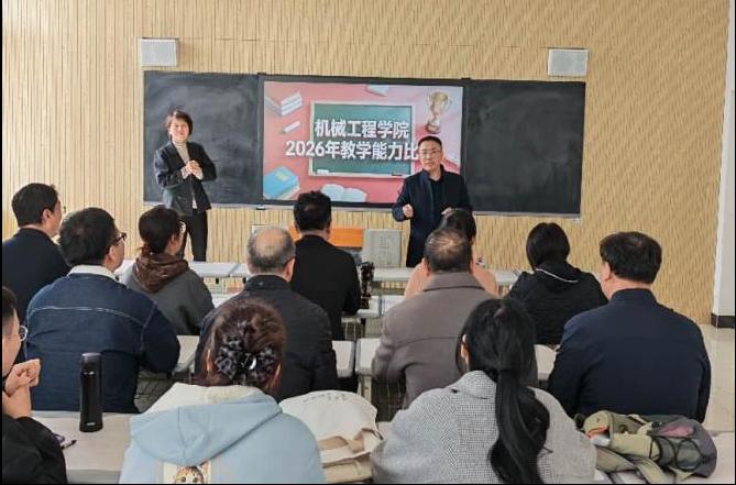 3月12日下午,机械工程学院在数控加工实训中心309教室举办2026年教学能力比赛。此次比赛,学院领导和所有本学期有教学任务的教师参加。评委由学校质量办公室吴立涛副主任、电气与控制工程学院金灵老师、商贸学院邵宁平老师、机械工程学院虎小雅老师等多次在区级、国家级教学能力比赛中获奖的教师担任。比赛由学院副院长王爱平主持,学院共有7支队伍参赛,结合赛项历年国赛及区赛要求,每支队伍选出1名教师讲授实施报告。