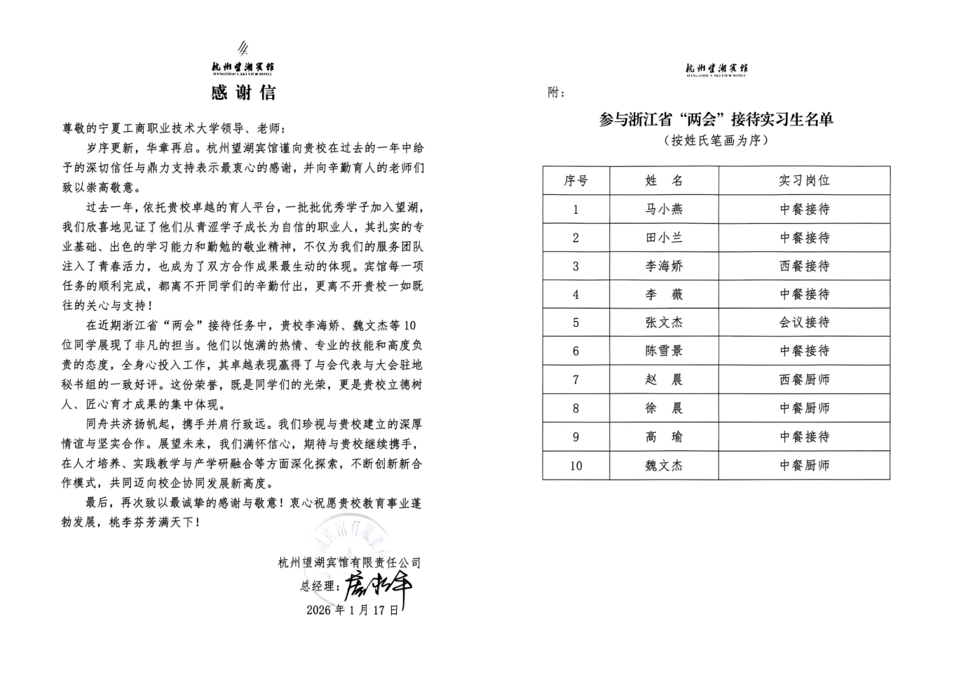 近日,旅游管理学院收到校企合作单位杭州望湖宾馆有限责任公司发来的感谢信。信中对我院10名实习生在浙江省两会高规格接待任务中的卓越表现给予高度评价,并对教师党支部在深化产教融合、培育高素质技术技能人才方面的扎实工作表示衷心感谢。这封感谢信是党支部扎实推进“强国行”专项行动,强化实践育人环节取得的又一显著成果。