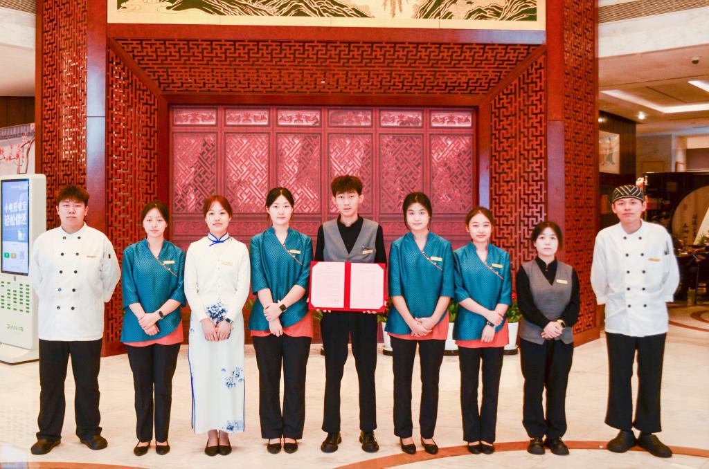 学院教师党支部坚持党建引领,积极构建“红色引擎”驱动下的校企协同育人新机制,以党员教师为主组建教学、实习指导教师团队,将实践教学课堂延伸至行业一线,精准对接产业高端需求。在本次浙江省两会接待工作中,李海娇、魏文杰等10位同学被选派至杭州望湖宾馆承担关键岗位服务保障任务。同学们不仅具备扎实的专业技能,更以饱满的政治热情、高度的责任感和精益求精的工匠精神全身心投入工作,在中餐接待、西餐接待、会议接待及中西餐厨师等多个岗位上表现出色,其专业素养与职业精神赢得了与会代表与大会驻地秘书组的一致好评。杭州望湖宾馆在信中特别指出,同学们的卓越表现是学校立德树人、匠心育才成果的集中体现。