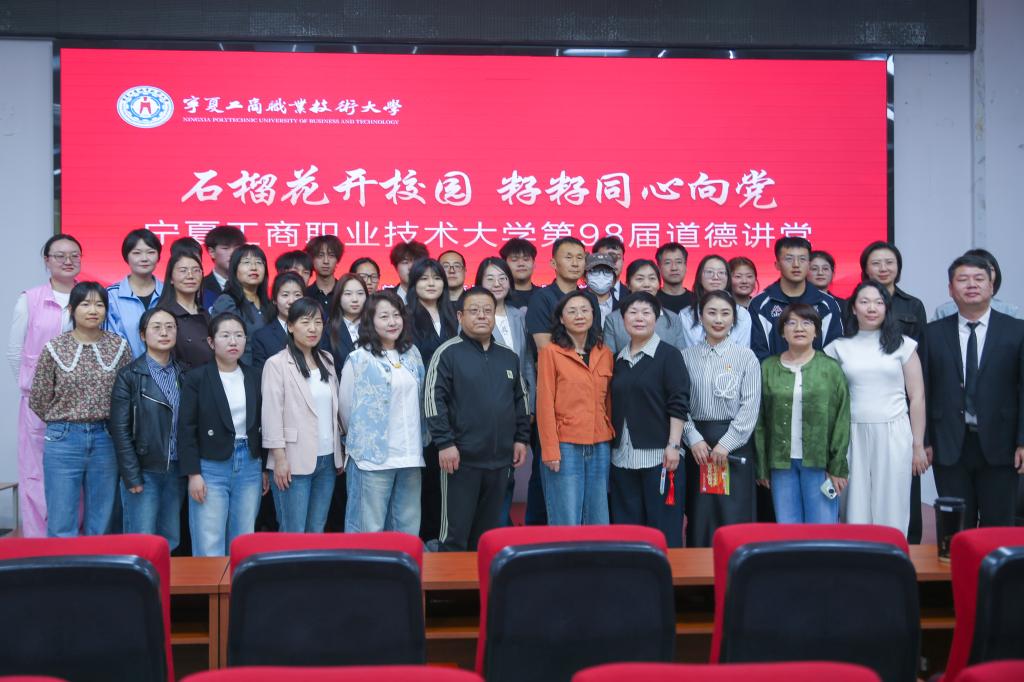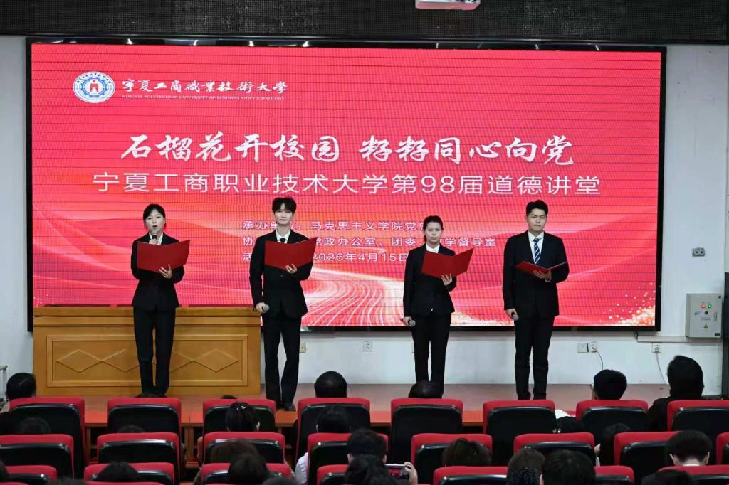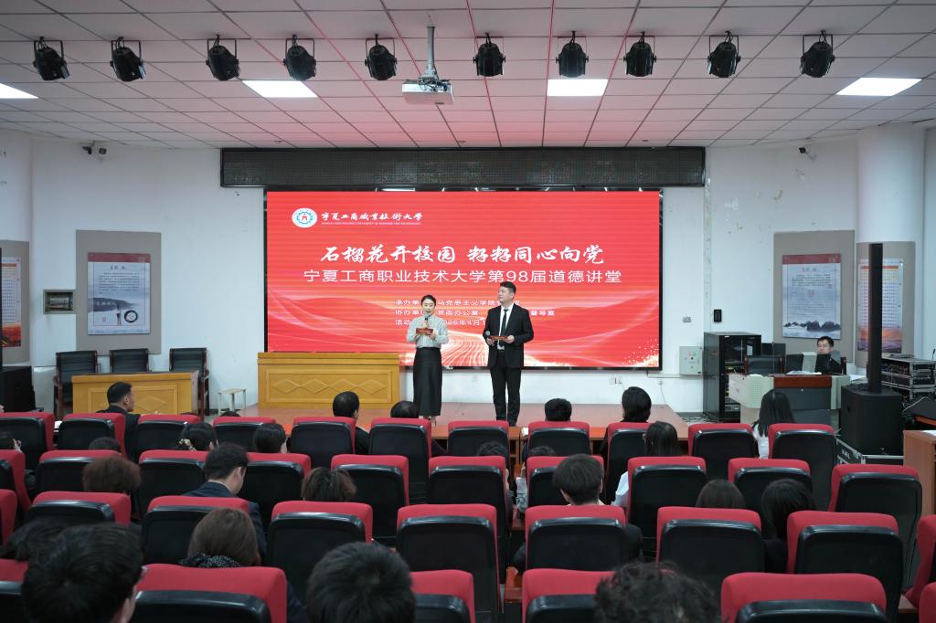 4月15日下午,宁夏工商职业技术大学第98期“道德讲堂”在清风园一楼举办。本期活动以“石榴花开校园 籽籽同心向党”为主题,由马克思主义学院承办,党政办公室、团委、教学督导室协办,师生代表齐聚一堂,同上一堂生动的思政大课。