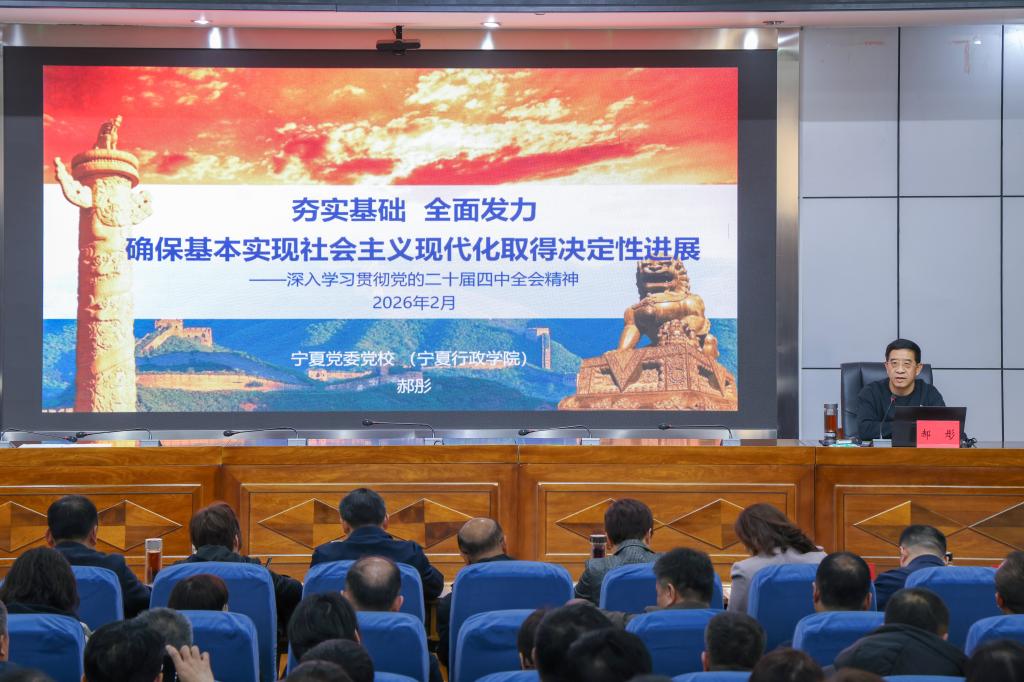 报告会上,郝彤教授以《夯实基础全面发力确保基本实现社会主义现代化取得决定性进展——深入学习贯彻党的二十届四中全会精神》为主题,从准确把握“十五五”时期在基本实现社会主义现代化进程中的重要地位、深刻领会“十五五”时期经济社会发展的指导方针和主要目标、全面理解“十五五”时期经济社会发展的战略任务和重大举措、坚持和加强党的全面领导凝聚起推进中国式现代化的磅礴力量四个方面展开深入解读。结合国内外形势热点与宁夏发展实际,系统阐释了全会核心要义,通过深厚的理论积淀、鲜活的实践案例和精准的数据分析,为与会人员呈现了一场兼具思想性、实践性和指导性的专题辅导。